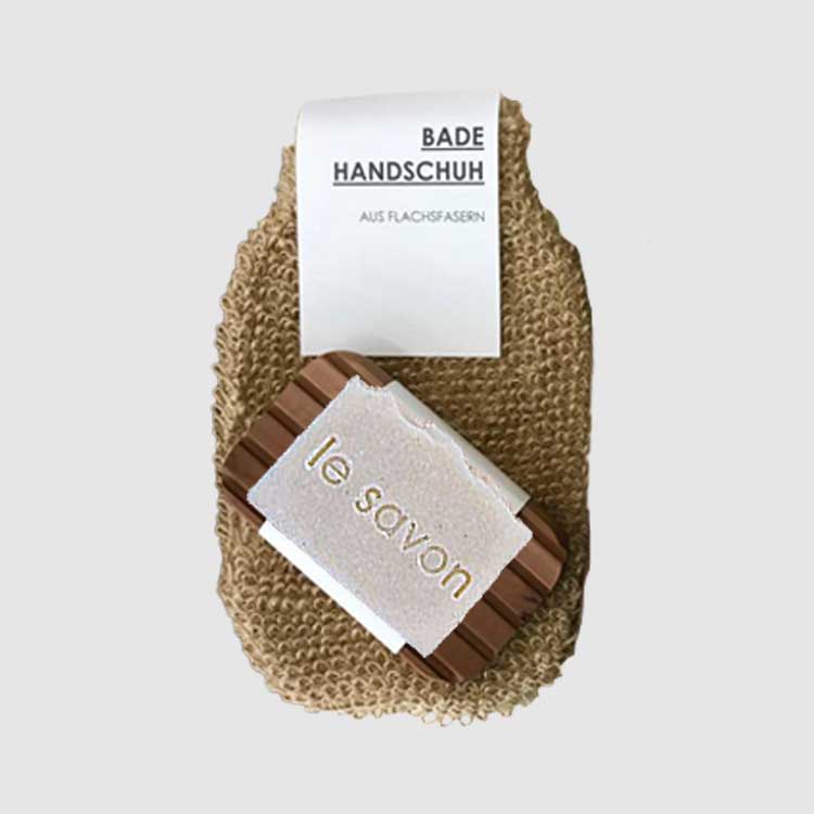 Verwöhn-Set mit einer handgefertigten Naturseife mit Peelingeffekt, einem dazu passenden Seifenablage aus Holz und einem Flachshandschuh für das Bad.