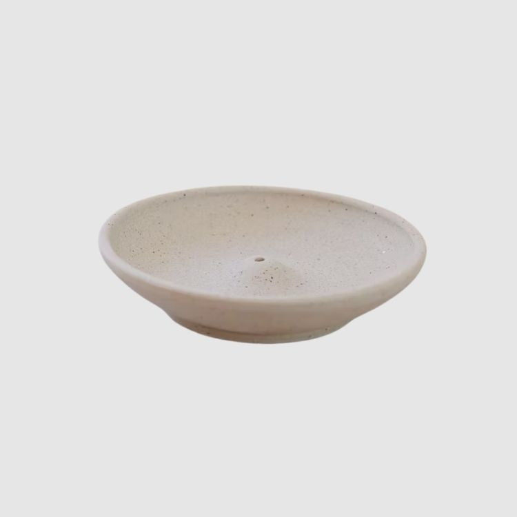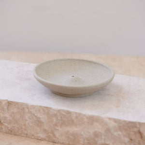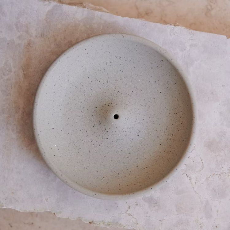 Ein schlichter, handgefertigter Keramikhalter, der sowohl kleinen als auch grossen Räucherstäbchen Halt gibt. Die Ausführung ist rau und unglasiert.