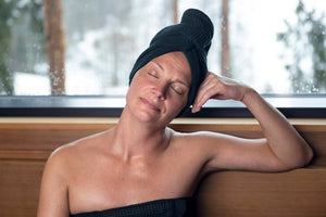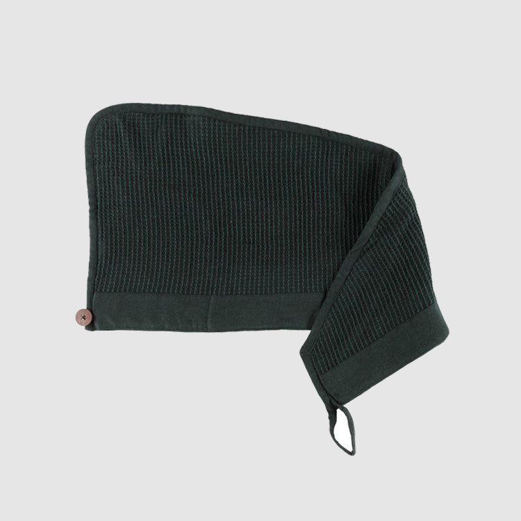 Praktisch und stilvoll: Das saugfähige Haartuch fixiert Ihr Haar mit einem Knopf aus Kokosnussschale, trocknet zuverlässig und schützt Ihr Haar in der Sauna. Hergestellt aus recycelter Baumwolle, veredelt mit Chambray-Bordüre. Waschbar bei 40 °C im Schonwaschgang.
